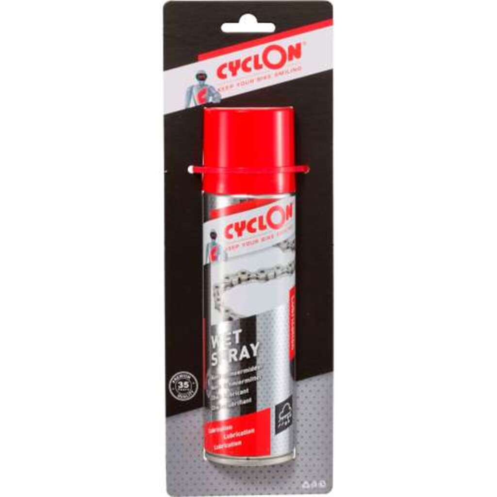 Cyclon Wet Spray 250ml op blister. Zeer sterk penetrerend P.T.F.E. houdend smeermiddel voor het optimaliseren van de ketting en schakelmechanismen. Is geschikt voor natte en extreme weersomstandigheden. Penetreert snel en efficient en zorgt voor een duurzame smerende werking. Te gebruiken bij temperaturen van -35 C tot 140 C. Geschikt voor kettingen van mountainbikes. Verkrijgbaar in een 250ml en 500ml spuitbus., NBL20303